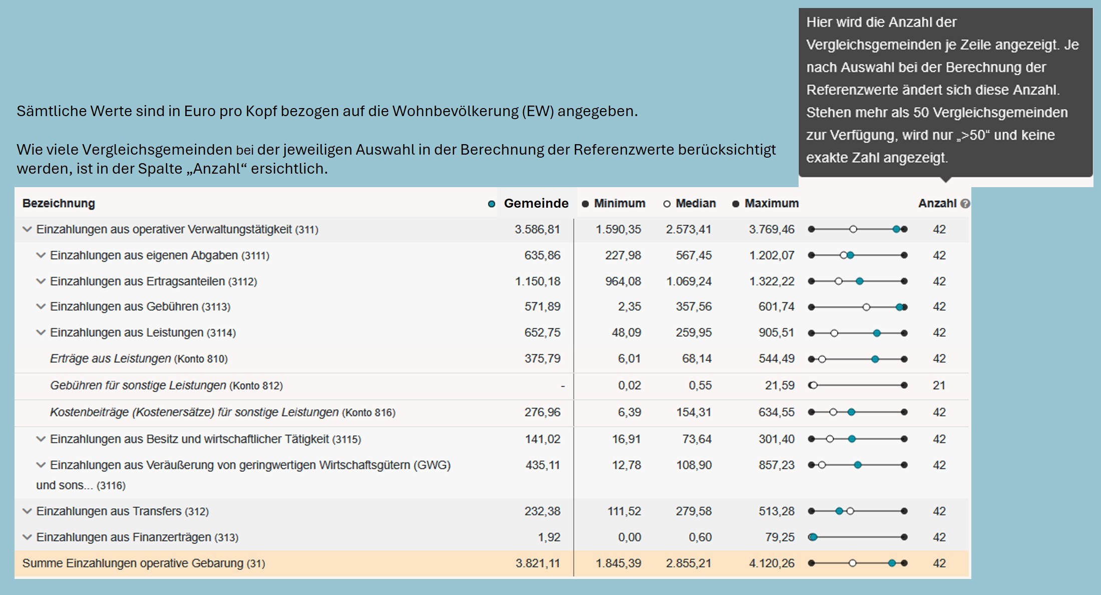 Ein wichtiger Hinweis für die Beurteilung der Aussagekraft der Vergleichswerte und Interpretation der Ergebnisse ist die in der Tabelle angegebene "Anzahl" der in der Referenzgruppe berücksichtigten Gemeindewerte.