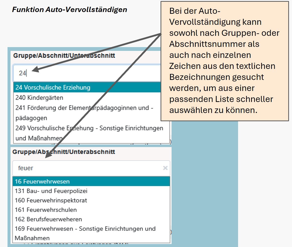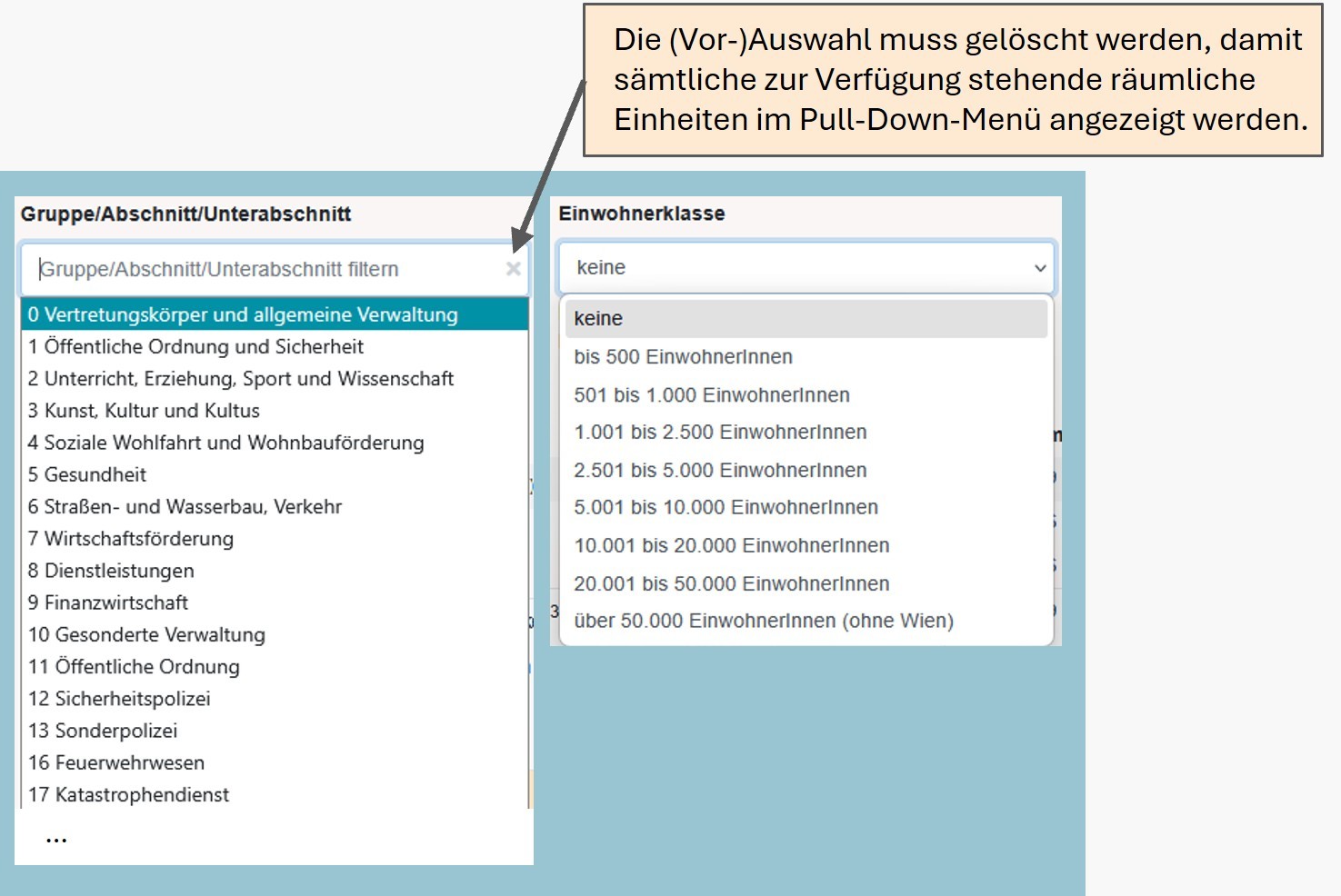 b) Optionale Felder: Auswahl spezifischer Aufgabenbereich des Rechnungsabschlusses "Gruppe/Abschnitt/Unterabschnitt" und/oder der Gemeindegröße "Einwohnerklasse"