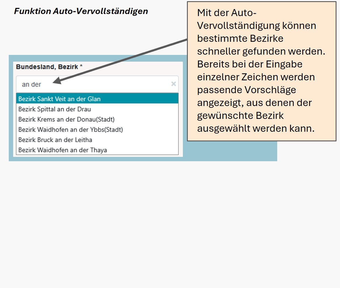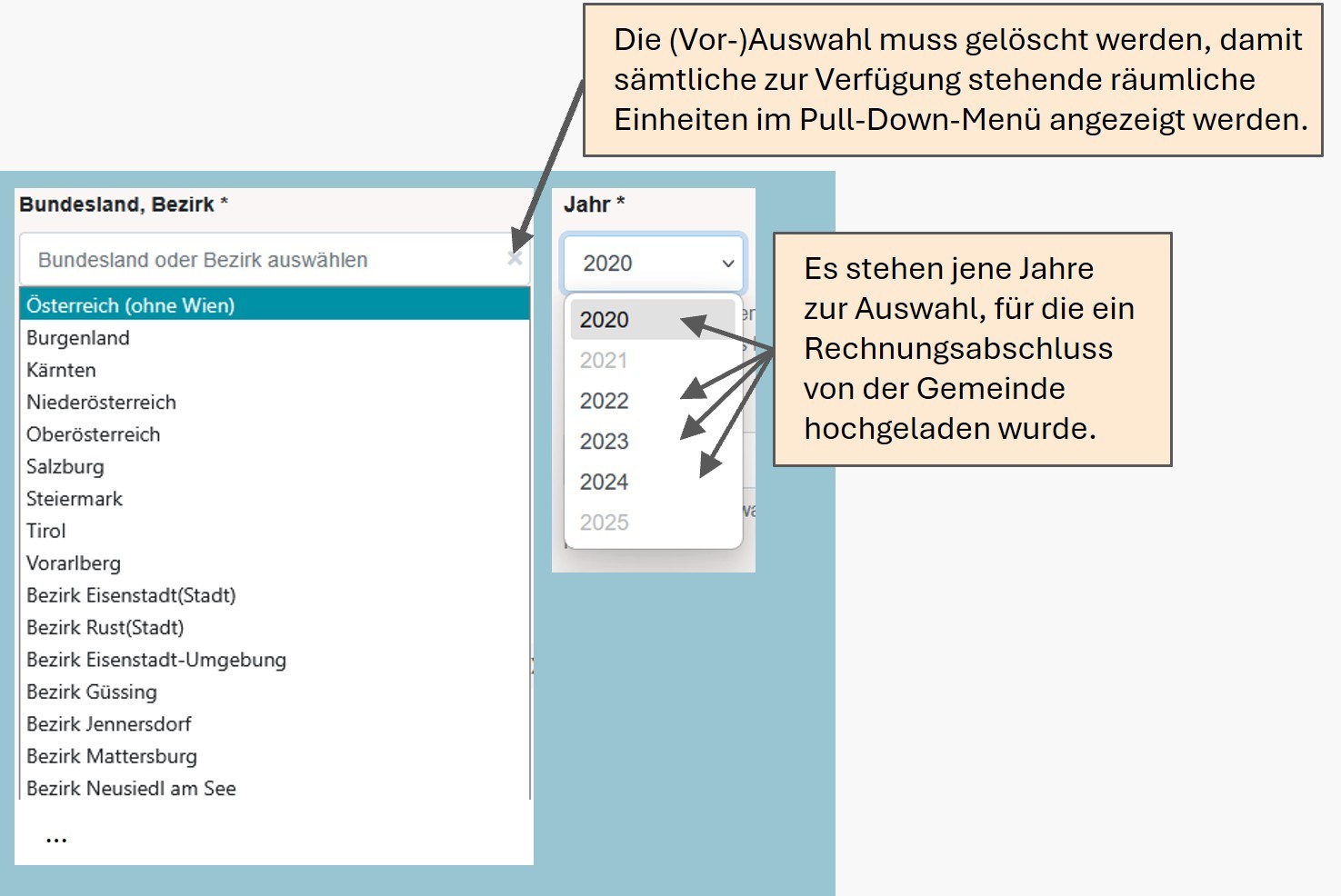 a) Pflichtfelder: Auswahl der regionalen Abgrenzung der Gemeinden: "Bundesland, Bezirk" und des Jahres des Rechnungsabschlusses "Jahr". Im Benchmarking stehen sämtliche Daten zu den Rechnungsabschlüssen ab dem Jahr 2020 (VRV 2015) zur Verfügung. Wird keine Auswahl getroffen, werden standardmäßig die Referenzwerte für „Österreich gesamt (ohne Wien)“ sowie das zuletzt verfügbare Jahr der Gemeinde angezeigt.