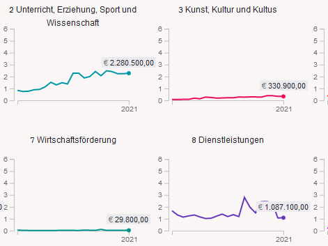 Dadurch können auch Details einer Gruppe (1. Dekade) detailliert dargestellt werden, die in der obersten Ebene als sehr flache Linie ersichtlich ist: man klickt dann auf die Überschrift (im Beispiel etwa auf "7 Wirtschaftsförderung" und gelangt dann in die nächsttiefere Ebene (Abschnitte, 2. Dekade), wo dann die Y-Achse entsprechend den dort vorkommenden Werte skaliert wird.