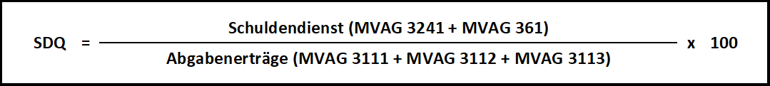Die Schuldendienstquote zeigt, welcher Teil der Abgaben (= Einzahlungen aus eigenen Steuern, Ertragsanteilen und Gebühren) für den Schuldendienst aufzuwenden ist. Abgaben sind Einnahmen, für die keine unmittelbare Gegenleistung erbracht werden muss. Die Kennzahl zeigt, wie groß der Anteil der Einzahlungen ist, der für den Schuldendienst verwendet werden muss. Unter Schuldendienst sind sowohl Zinszahlungen als auch Tilgungen zu verstehen.
