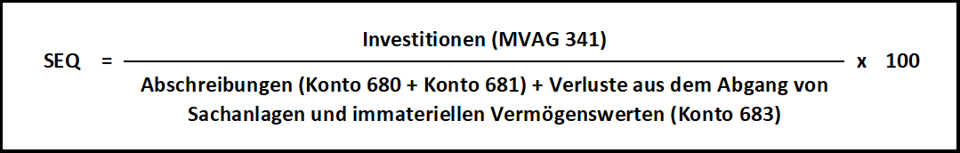 Die Substanzerhaltungsquote beurteilt, in welchem Ausmaß die getätigten Investitionen die Vermögenssubstanz erhalten. Die Kennzahl wird wie folgt berechnet: